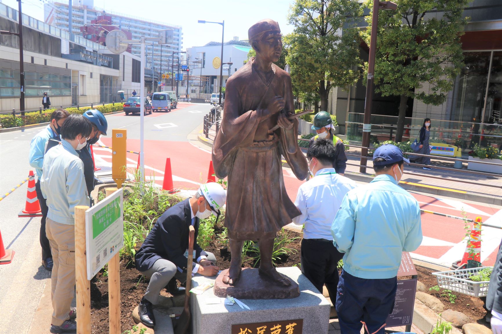 令和5年5月10日、千住大橋からほど近い、南千住駅の西口駅前広場に設置している「松尾芭蕉像」の植栽を日本の草花とすることで、日本の原風景を再現しようとの試みをスタートしました。