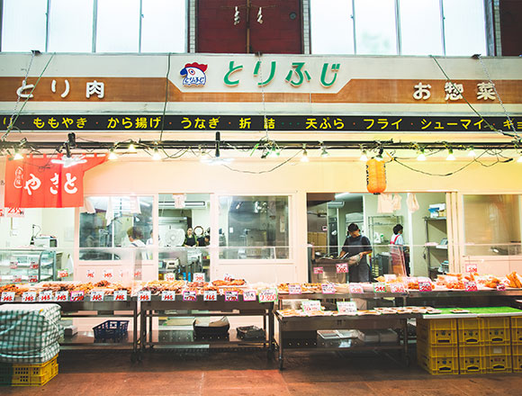 바쁠 때 현지인들은 가게에서 파는 요리나 반찬으로 식사를 해결하는 경우가 많습니다. 일본인들이 좋아하는 반찬을 여러분도 한번 사 보시면 어떨까요? ‘도리후지’는 닭꼬치 전문점이지만, 생선요리나 야채요리 등 70종류 이상의 반찬을 갖추고 있습니다. 닭꼬치에 사용하는 고기는 품질과 가격을 중시하여 일본 각지에서 구매하고 있습니다. 구입한 닭꼬치는 가게 밖에서 바로 먹을 수 있습니다. 서글서글한 인상의 직원이 향신료나 머스타드 등의 조미료를 준비해 줍니다. 아케이드 안에 있는 여러 반찬가게나 야채가게에서 신선한 야채나 과일, 각종 요리나 반찬을 저렴한 가격에 살 수 있습니다.