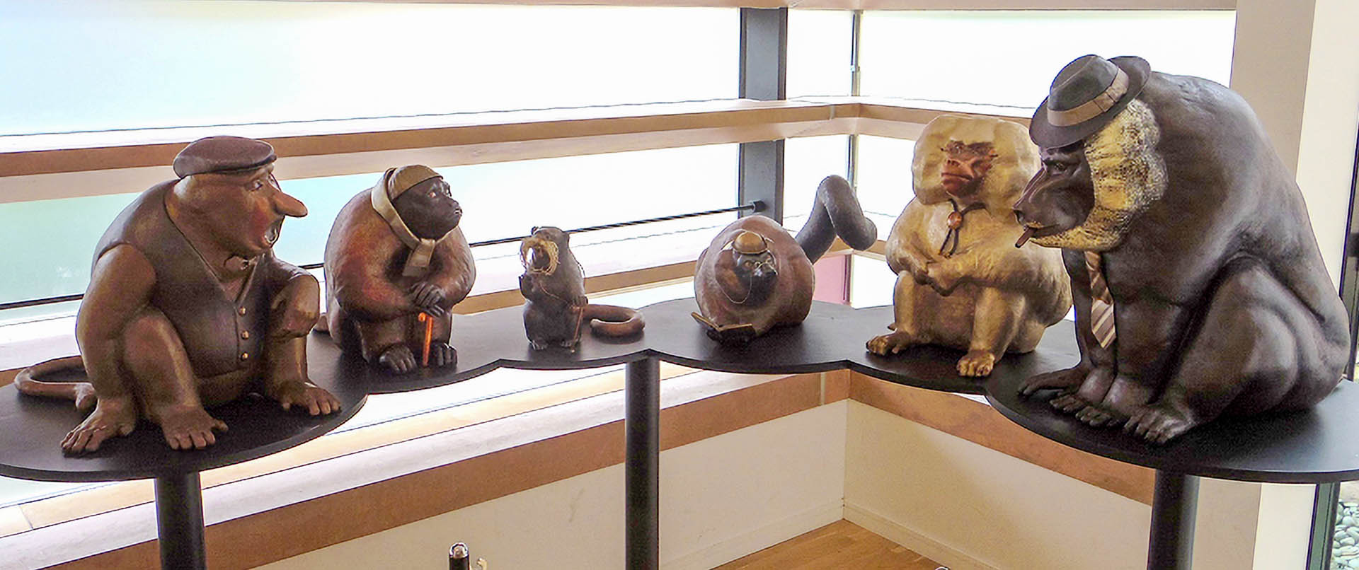 원숭이에게도 성격이 있고, 커뮤니티가 있으며, 그 안에서도 한 마리 한 마리의 입장이라는 것이 있습니다. 종류만으로 파악하는 것이 아니라, 각자가 지닌 개성을 작품을 통해 표현했습니다. 동물들을 인간과 같은 움직임을 취하게 하거나, 인간과 같은 모습으로 만들면 더욱더 받아들이기 쉽고 친근하게 느껴집니다. 이는 동물이나 곤충에게서 인간미가 느껴지는 일면을 봤을 때 받는 유머러스함이나, 누군가와 닮았을 때 사랑스럽게 느껴지는 감정과 비슷하다고 생각합니다. 원숭이에게 성격과 커뮤니티를 표현할 때도 이러한 점을 큰 요소로 도입했습니다. 동물원에 있는 원숭이를 봤을 때 사람에 가까운 모습이나 움직임에서 한 종류로 우리에 넣어진 모습에 위화감을 느꼈고, 한 마리 한 마리의 성격을 더욱더 잘 느낄 수 있다면 그들을 바라보는 방식도 변하리라 생각하여 이 작품을 제작했습니다.