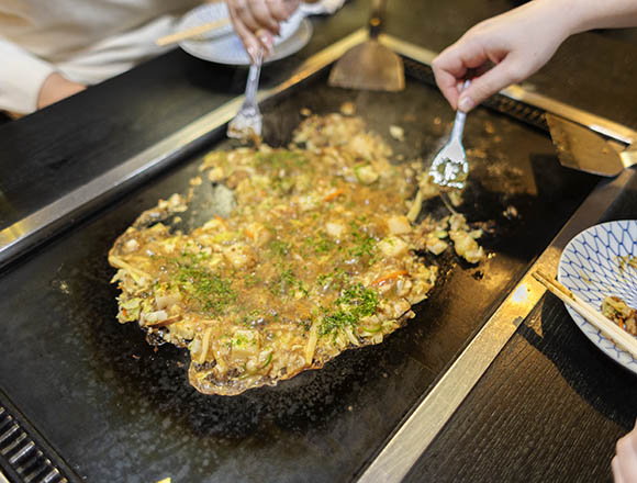 익히는 정도는 각자의 취향 대로. 걸쭉한 몬자야키를 좋아하는 사람도 있고, 잘 구워서 바삭한 몬자야키를 좋아하는 사람도 있습니다. 따뜻한 철판 위에서 천천히 굽기 때문에 다양한 식감을 즐길 수 있습니다. 몬자야키는 전용 주걱으로 떠서 먹습니다. 젓가락에 익숙하지 않은 사람도 안심할 수 있습니다.