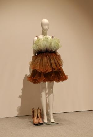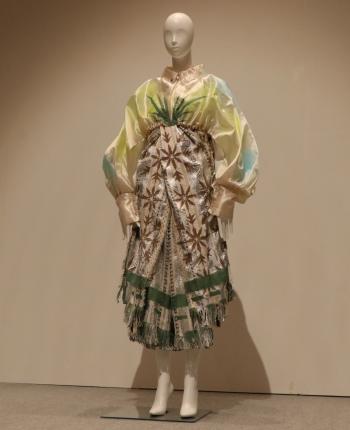 繊細な花をテーマに、日暮里の街の美しさを表すプリント生地をふんだんに使用し、更にプリーツ加工を施すことで、立体的な花のドレスで表現しました。