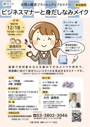 女性を対象に再就職に向けたビジネスマナーと身だしなみメイクを開催いたします。ハローワークの求職活動実績となるセミナーです。