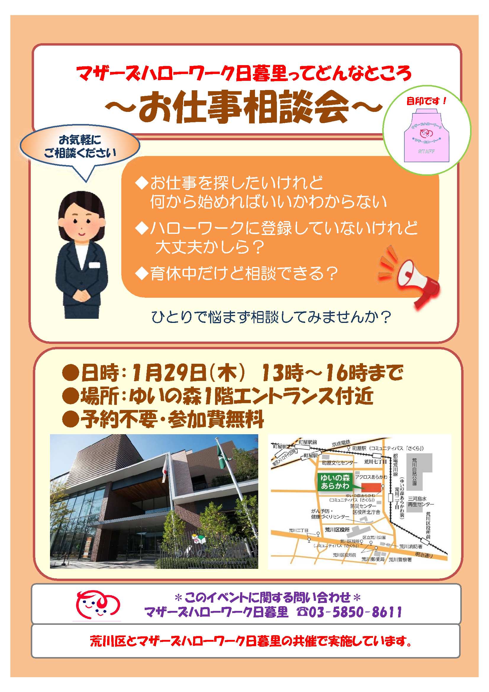 マザーズハローワーク日暮里が、1月29日(木曜)に、ゆいの森1階エントランスで出張相談を行います。