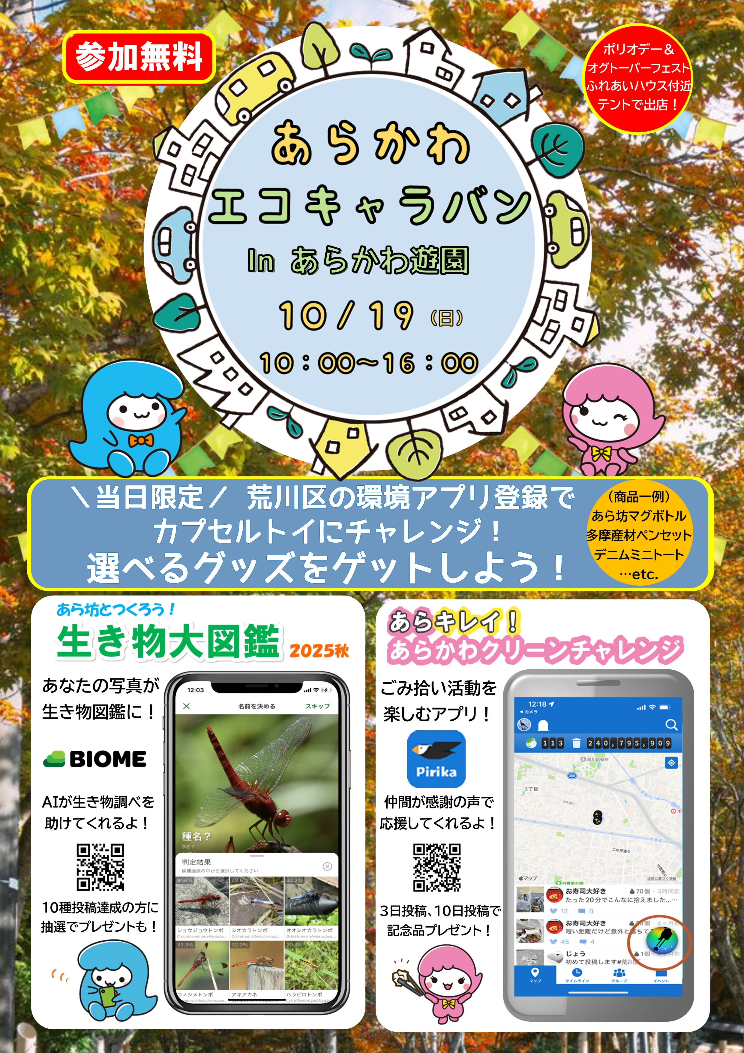 当日会場で、スマホアプリを使った環境イベント「あら坊とつくろう!あらかわ生き物大図鑑2025秋」のアプリインストール完了画面、または「あらキレイ!あらかわクリーンチャレンジ」のユーザー登録完了画面をスタッフに提示すると、カプセルトイ1回分の権利GETです!(両方のアプリ登録でチャンス2回!)