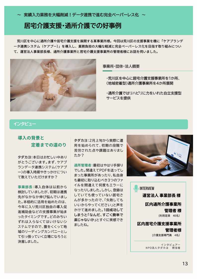 まだ導入していない事業所の方に、より広くケアプランデータ連携システムの導入効果を知っていただくため、令和7年度に実施した伴走支援の結果をもとに、導入効果や好事例を紹介する資料を作成しましたので、ぜひご覧ください。