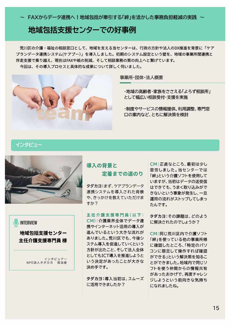 令和7年11月から令和8年3月まで実施した伴走支援を利用し、区内で新たに30事業所がケアプランデータ連携システムを導入しました。導入した事業所からは、業務改善を実感している声が聞かれています。今後、このシステムの効果を最大限に発揮するために、一層の普及拡大を目指していきます。